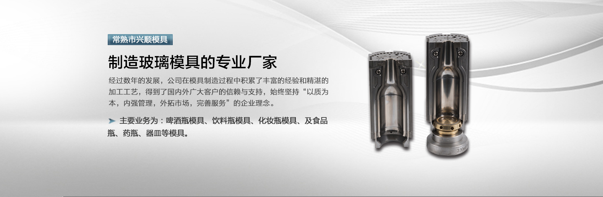 常熟市興順模具有限公司位于中國(guó)玻璃模具之鄉(xiāng)——江蘇常熟沙家浜,是一家制造玻璃模具的廠家。公司成立于1992年,主要業(yè)務(wù)為:啤酒瓶模具、飲料瓶模具、化妝瓶模具、及食品瓶、藥瓶、器皿等模具。我們擁有23年的模具制造經(jīng)驗(yàn),目前公司擁有員工100多人,我們公司目前主要出口到印度,西班牙,意大利,俄羅斯,越南,泰國(guó)等等。公司目前裝備有50多臺(tái)CNC車床和雕銑設(shè)備,一些是從日本引進(jìn)的小巨人,還有德國(guó)的德瑪吉,我們有自己的鑄造車間來(lái)保證模具材料的穩(wěn)定性。